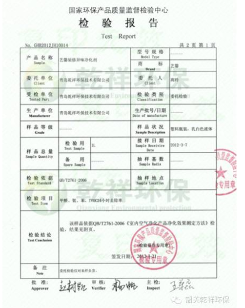 藝馨裝修異味凈化劑檢測(cè)報(bào)告